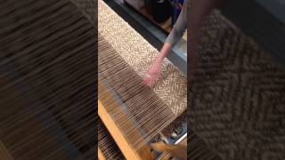 Meg working on a 12′ x 12′ Creswell rug for a client in Nashville. She is weaving an overshot style pattern so she alternates between one pick of the background color one pick of the pattern color.